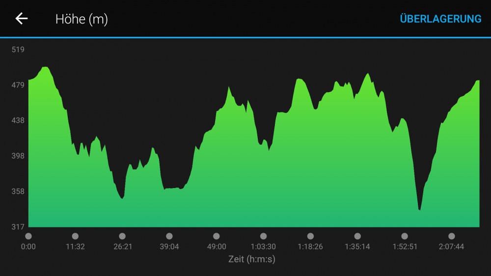 Punkt 17 Uhr erfolgte der Start, und es ging sofort mal nen halben Kilometer bergauf; richtungsweisend auf das, was uns noch erwarten sollte. Nach der ersten Steigung verlief die Strecke etwas flacher, danach ziemlich lange bergab; in der Gewissheit, dass wir dann auch wieder hoch müssen.