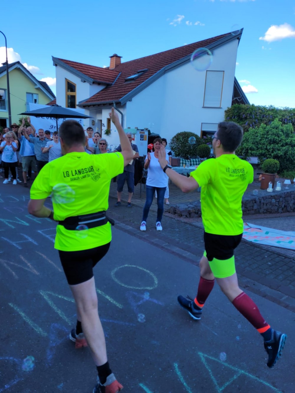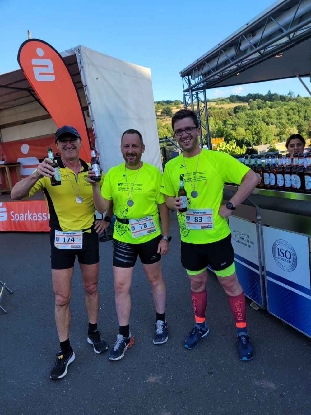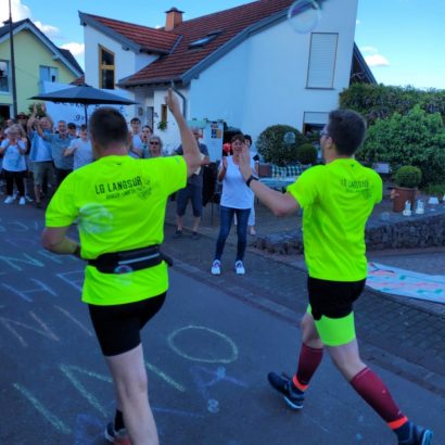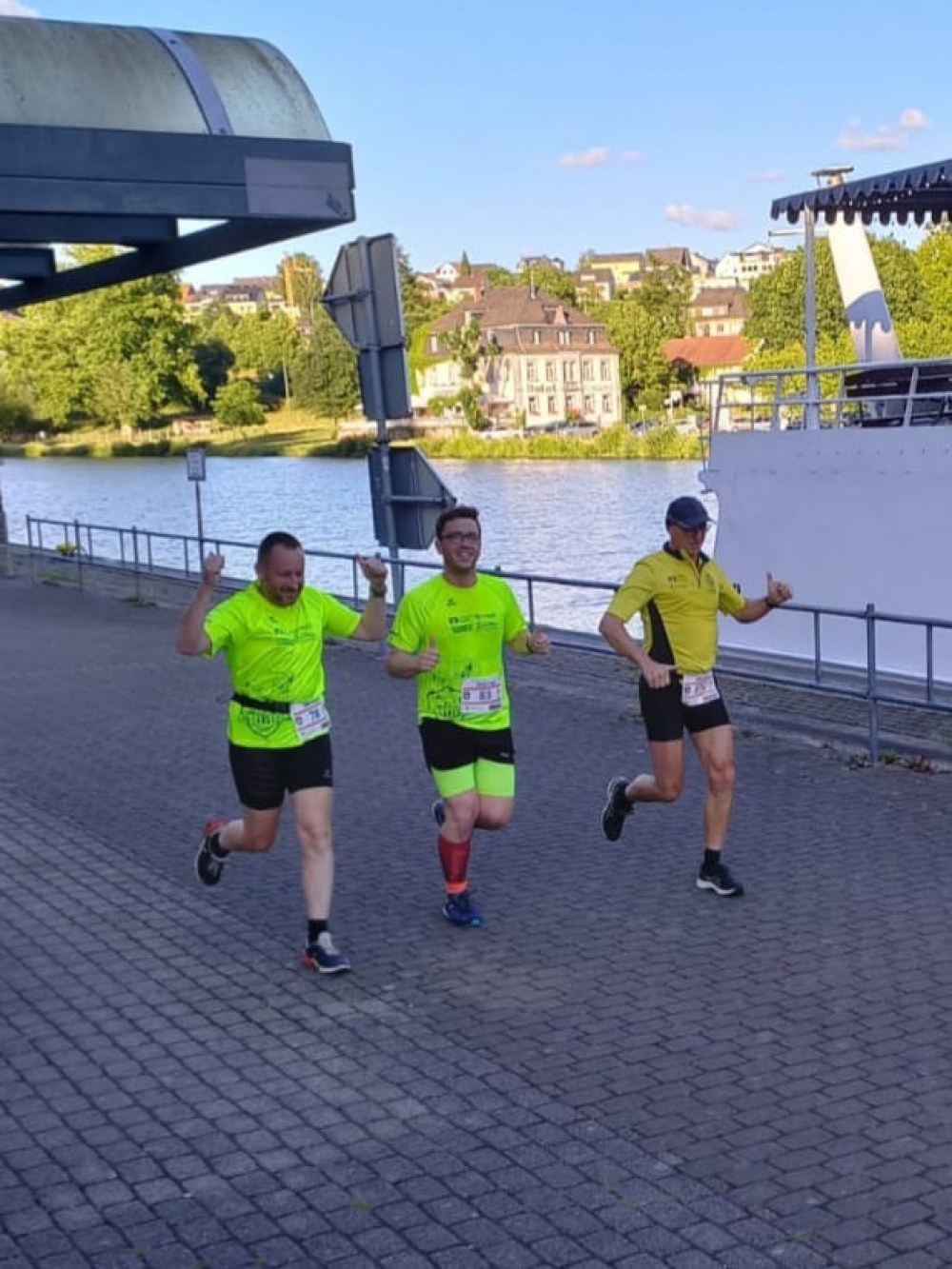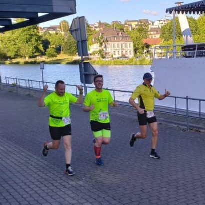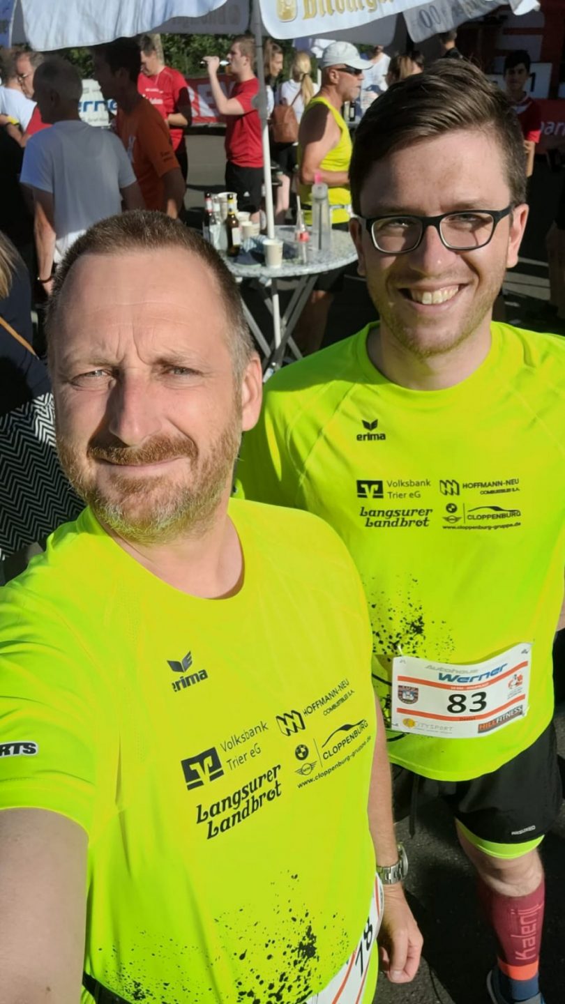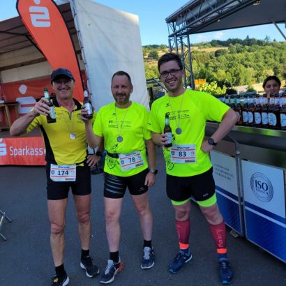 Eingebettet war der Lauf in das Wochenende der Saarburger Markttage, entsprechend groß war der Zuschauerzuspruch. Vorbei ging es also nicht nur an vielen Menschen, sondern auch an duftenden Süßigkeiten- und Essensständen und noch verlockenderen Getränkewagen. Eisern absolvierten die drei Läufer jedoch die Strecke, ehe sie der wohlverdienten gekühlten Belohnung entgegensahen. Alle drei unterboten knapp die 55min, sodass ein wunderbares Fotofinish zustande kam, und wir gleichzeitig die Ziellinie überquerten.