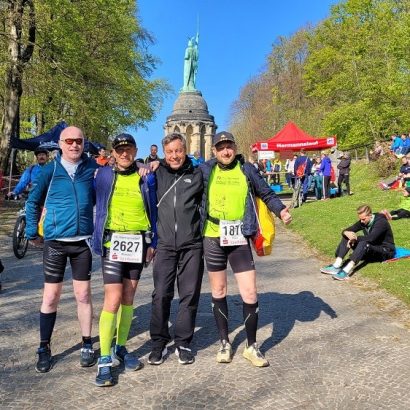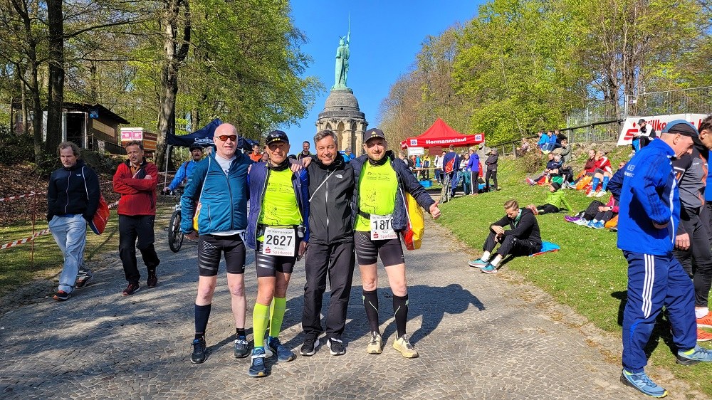 Dann war es endlich sowei. Nach einem guten Frühstück begaben wir uns zeitig zu den Bussen, die uns zum Start am Hermannsdenkmal nach Detmold brachten. Hier tummelten sich bei sensationellen Jubiläumswetter bereits zahlreiche Läufer*innen, die sich, wie wir auf den Startschuss vorbereiteten. Noch schnell die letzten persönlichen Feinheiten (Einreiben, Wasser trinken, Riegel einpacken etc.) erledigt, ging es dann ab 11.00 Uhr in mehreren Startblöcken endlich los. 31,1 km schwieriges Gelände lagen vor uns.