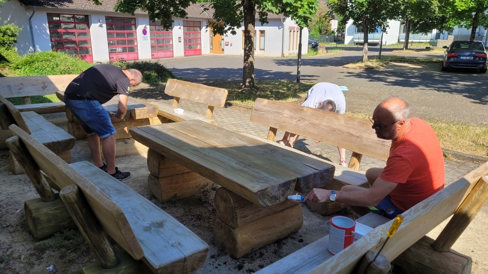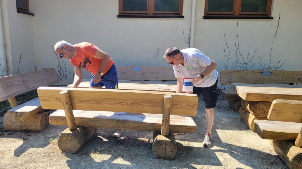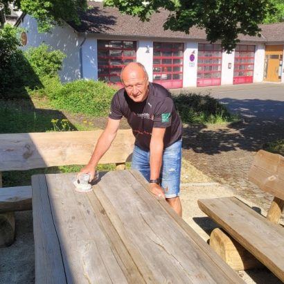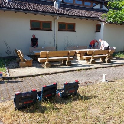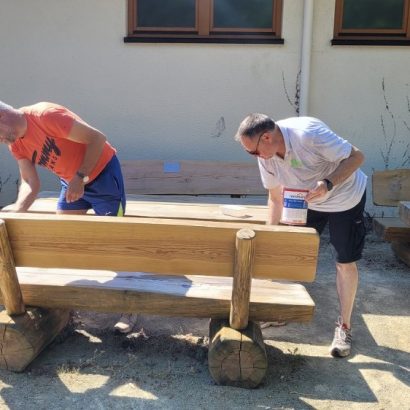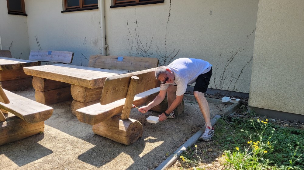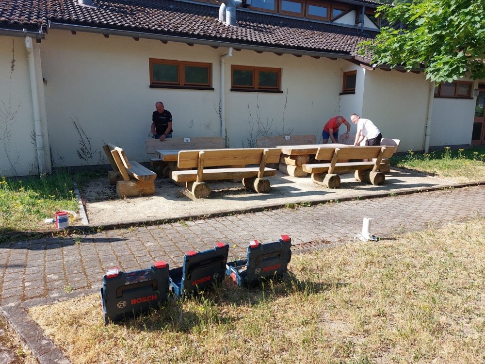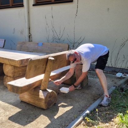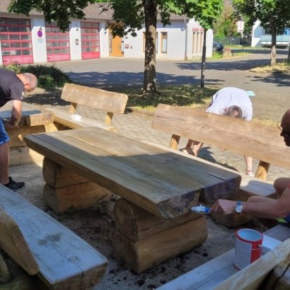 Unsere schöne und immer noch neue Sitzgruppe an der Turnhalle „feierte“ vor kurzem den 1. Geburtstag. Damit sie noch viele Geburtstage feiern kann, verpassten Ihr 4 fleißige LG’ler einen Anstrich mit einer hochwertigen Holzschutzfarbe. Reinigen, schleifen und streichen war bei knapp 30 Grad eine schweißtreibende Angelegenheit. Aber der Einsatz war für alle, die die Sitzgruppe regelmäßig nutzen, eine lohnende Sache. Anbei ein paar Fotos von der Aktion.