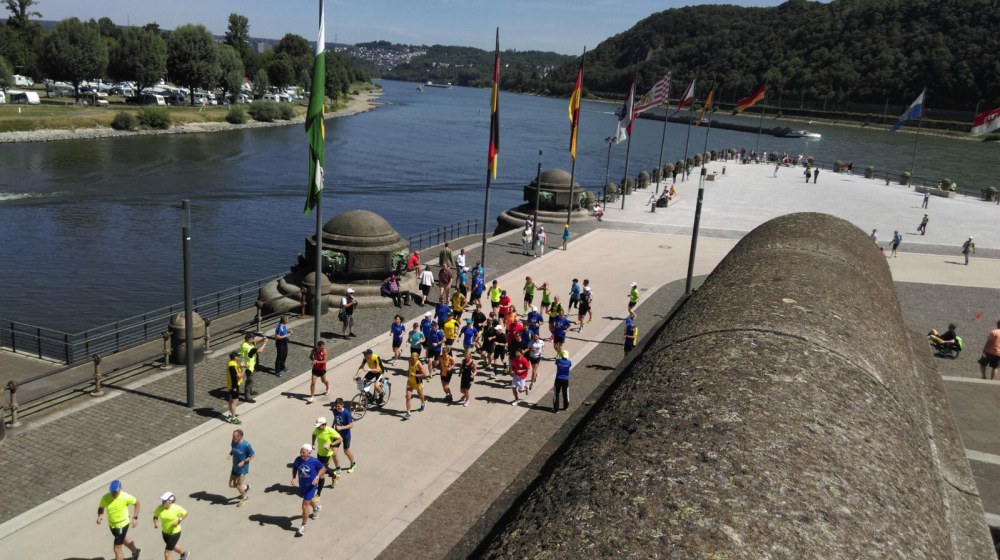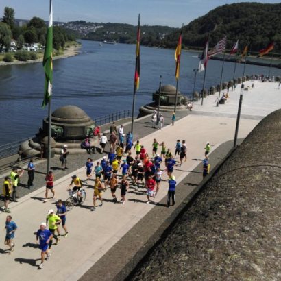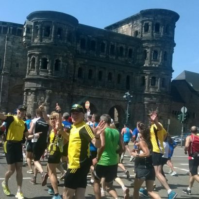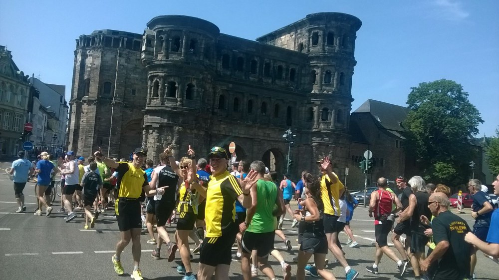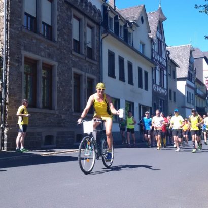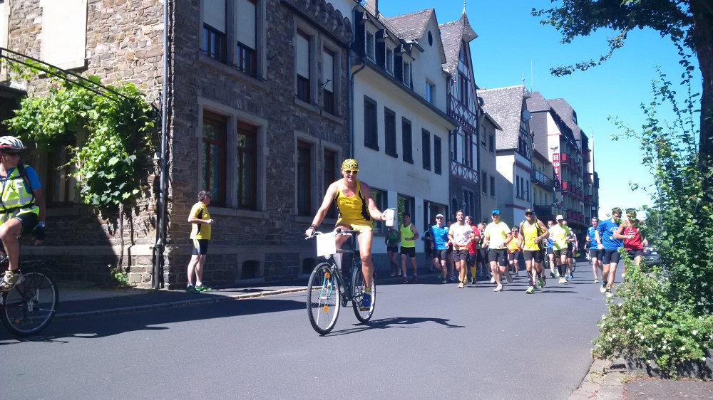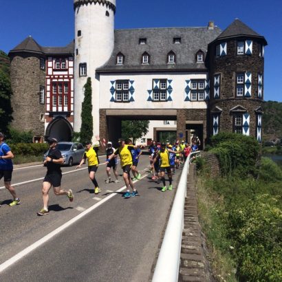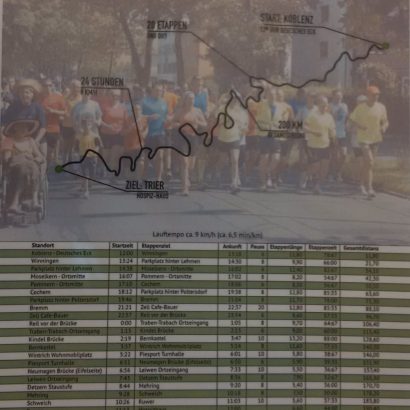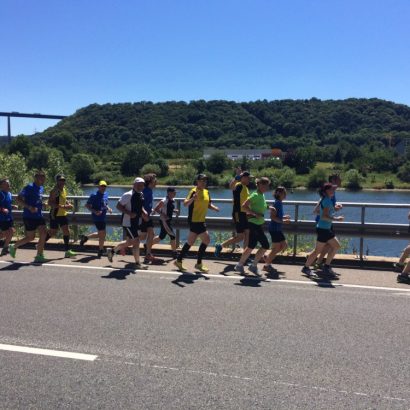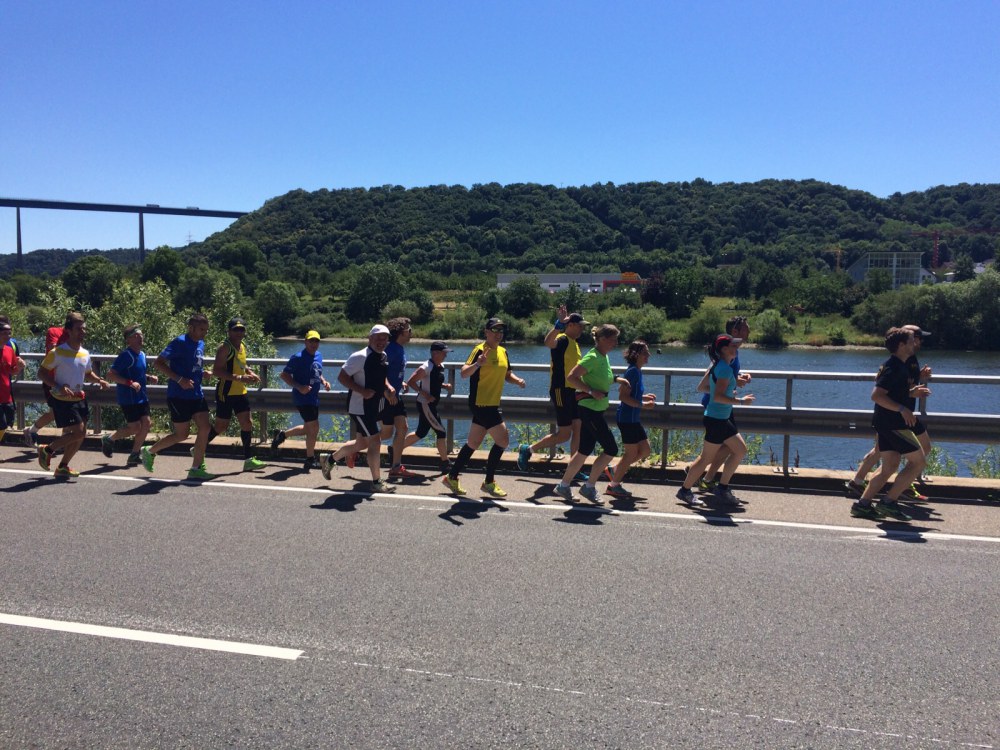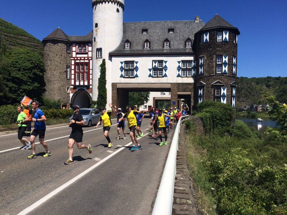 Am Start stand die Sonne schon hoch und und heizte uns auf, jedoch gab es hin und wieder noch ein kühles Lüftchen. Das war bald vorbei. Die Sonne knallte spätestens ab Moselkern erbarmungslos auf die Läufer nieder. Der Wind war nicht mehr zu spüren. Genug trinken und Sonnenschutz waren wichtiger den je. Die Etappe nach Bremm hatte wie jedes Jahr etwas ganz besonderes durch den Lauf in die untergehende Sonne. Die darauf folgende Etappe nach Zell brachte dann die Nacht, und der Läufertross lief in der Dunkelheit weiter. Die folgenden Etappen in kompletter Dunkelheit mit Stirnlampe verbreiten eine Art meditative Stimmung unter den Läufern. Die Etappe von Bernkastel nach Wintrich erlöste die Teilnehmer wieder von der Dunkelheit. Als ab der Nußbaumallee in Brauneberg die Vögel begannen zu zwitschern und den Tag begrüßten, erwachten die Lebensgeister in uns wieder. Dann ein Blick zurück; der Lohn ein roter Morgenhimmel. Ab Leiwen wurde die Läuferschlange länger und länger. Auf der letzten heißen Etappe von Ruwer nach Trier war ein sehr großes Läuferfeld unterwegs. Geschaft! Im Garten des Hospizhauses gab es bei Musik dann die ersehnte letze Erfrischung des Laufs. Dann folgte die Regeneration, die jeder für sich bewältigen musste.
