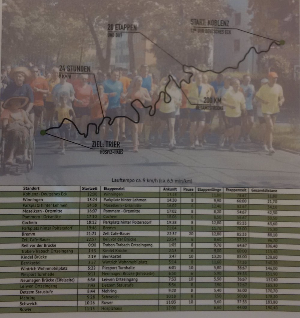 Das Hospizhaus in Trier benötigt jedes Jahr viele Spenden, damit todkranken Menschen ein würdevolles Sterben ermöglicht werden kann. Alle Teilnehmer am Hospizlauf sind Boten für diese gute Sache. Es geht darum, auf das Hospizhaus aufmerksam zu machen und Spenden für diese wichtige Einrichtung zu sammeln. Jeder Teilnehmer gibt eine Spende als eine Art Startgebühr, viele kaufen T-Shirts und zahlen da auch etwas mehr, als diese eigentlich kosten. Es waren auch Staffeln am Start, bei denen Sponsoren einen festen Betrag pro gelaufem Kilometer spenden. Der Hauptsteuermann unseres Begleitfahrrades Edgar sammelte fleißig mit einer Spendendose an der Strecke Geld von den Zuschauern. Mika überreichte die Spende der LG Langsur; einen Scheck über EUR 500.-. Wieviel insgesamt zusammengekommen ist und weiteres zum Hospizlauf könnt Ihr im Internet unter www.hospizlauf.de nachlesen.