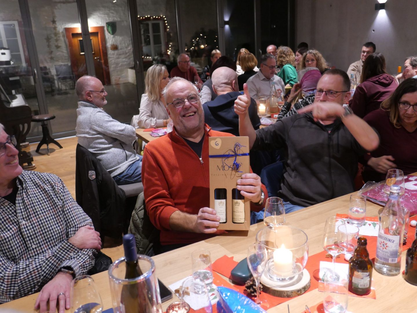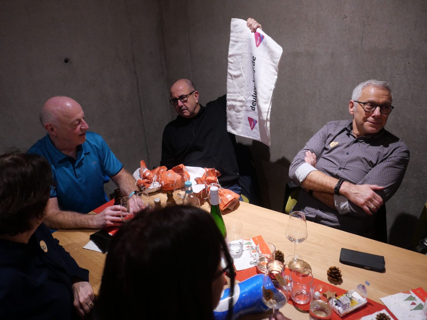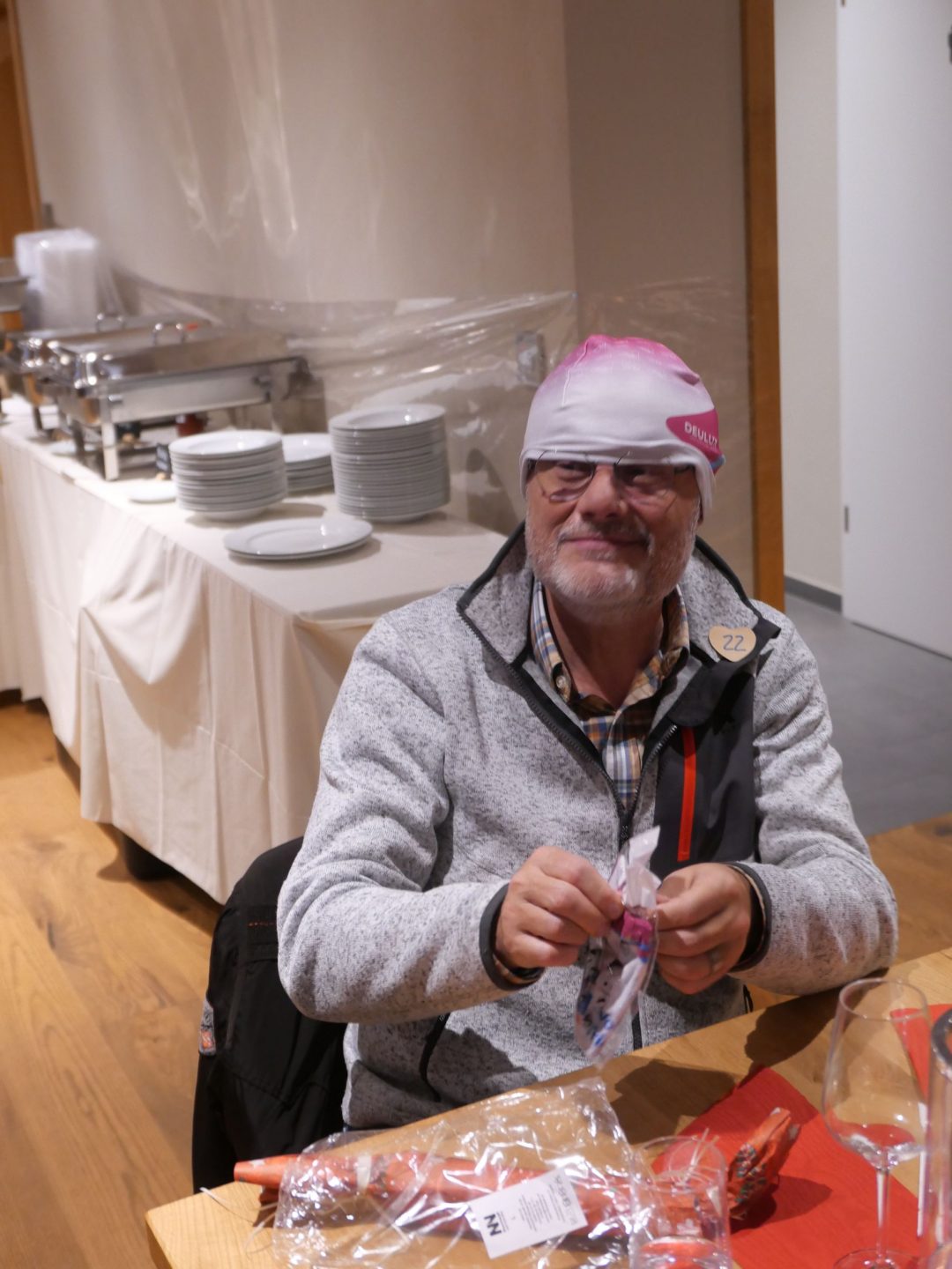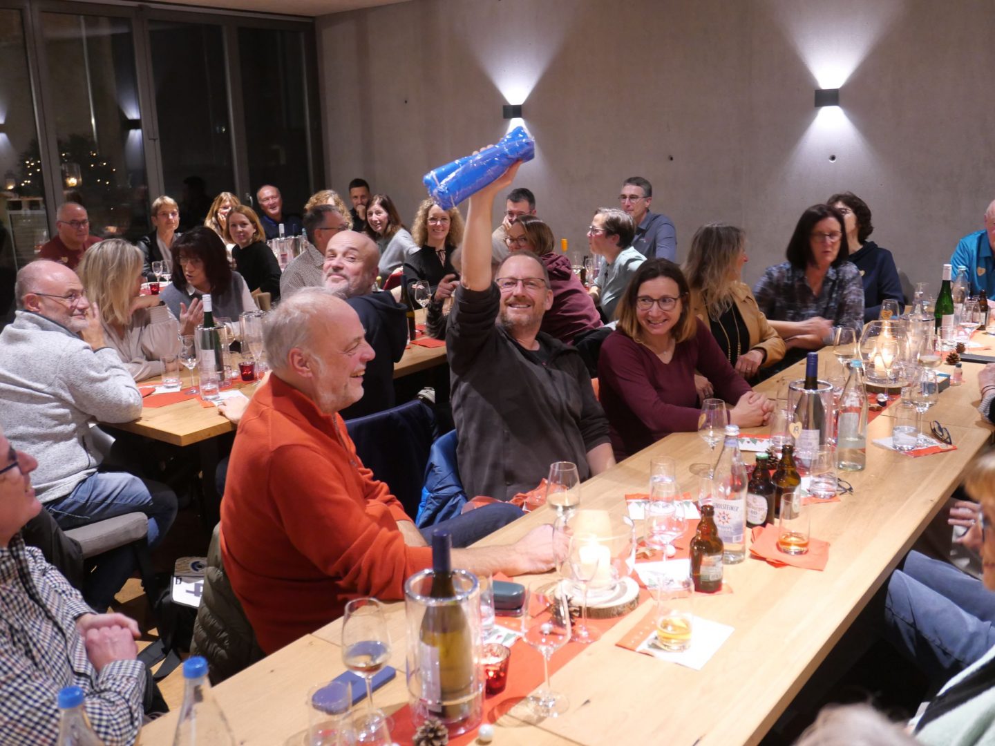 In der Weinstube ging es mit leckerem Essen vom lokalen Caterer und einer ausgesprochen überzeugenden Weinauswahl weiter. Höhepunkt des Abends war wie immer die Bescherung aus dem prall gefüllten Merchandising-Fundus – von Badetüchern über Badeöle bis hin zu Laufmützen und Buffs war alles dabei.
