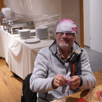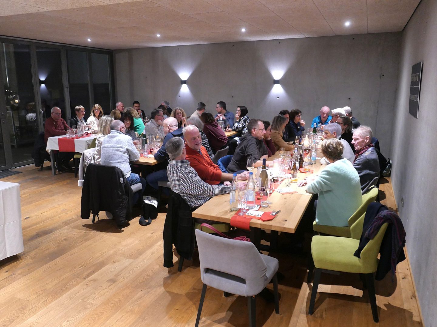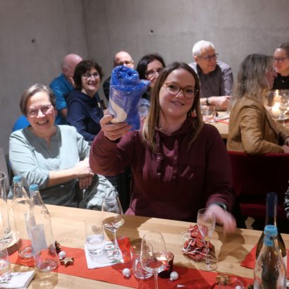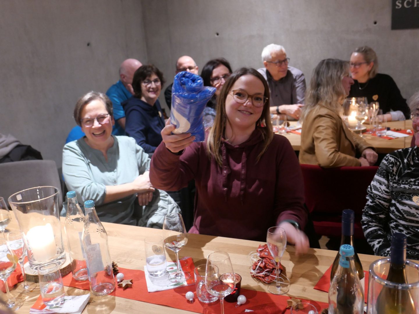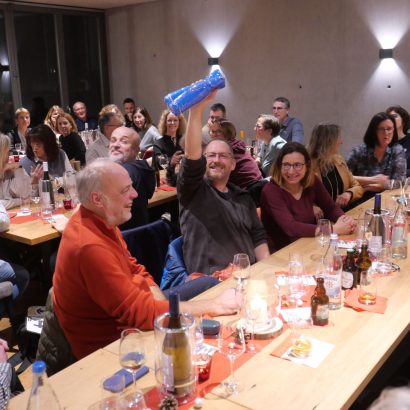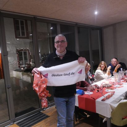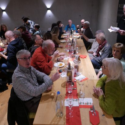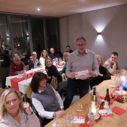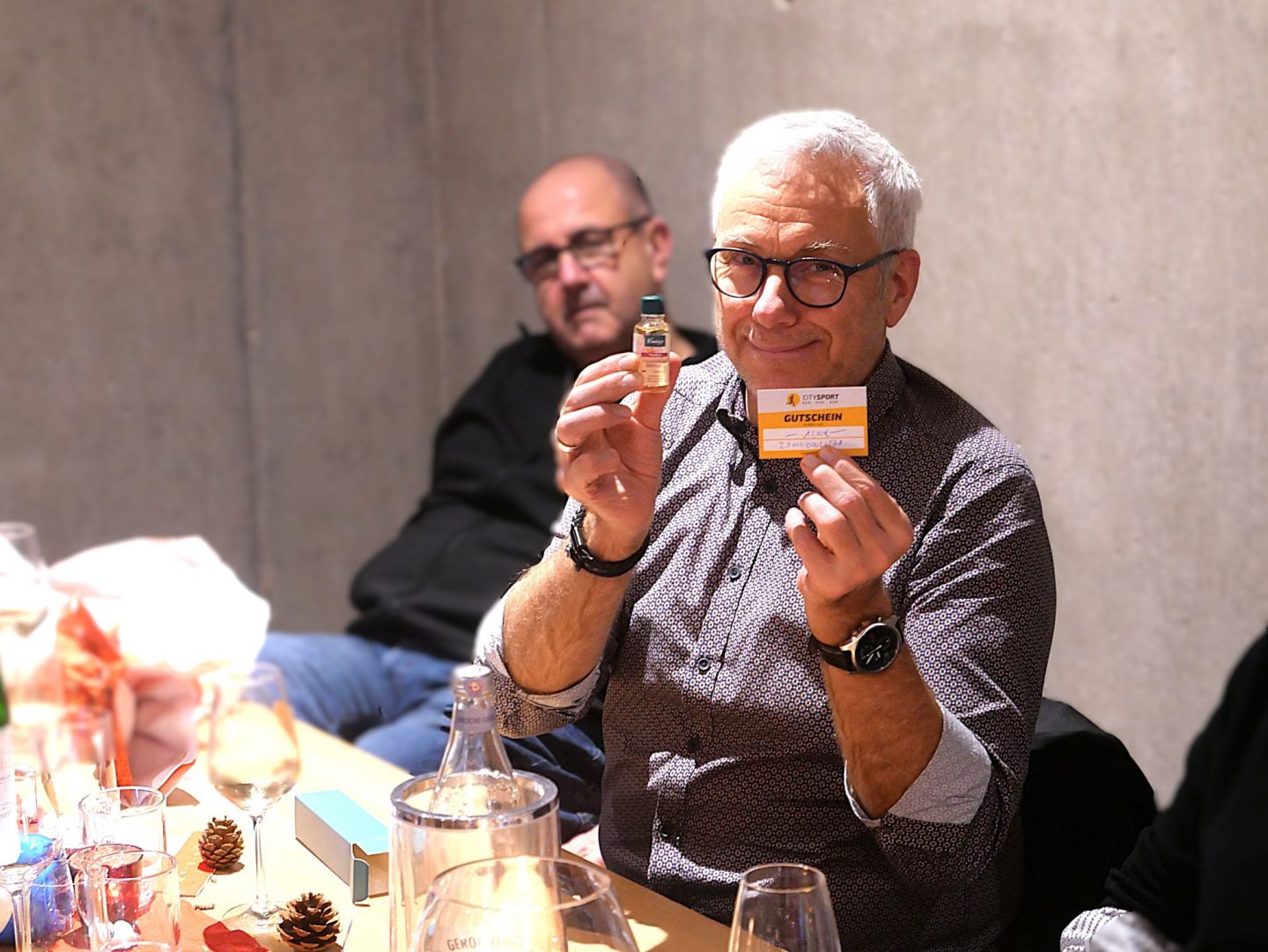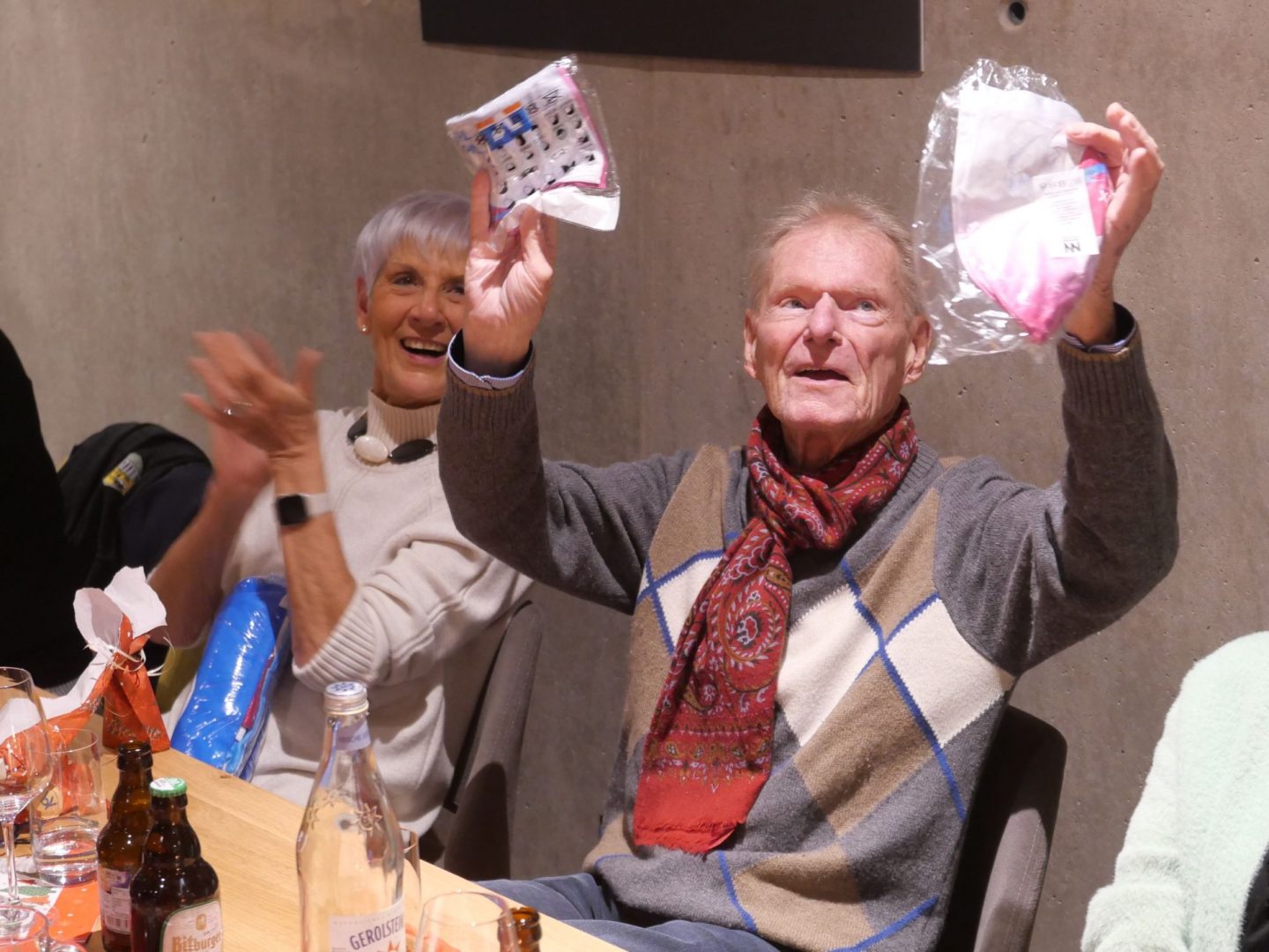 In der Weinstube ging es mit leckerem Essen vom lokalen Caterer und einer ausgesprochen überzeugenden Weinauswahl weiter. Höhepunkt des Abends war wie immer die Bescherung aus dem prall gefüllten Merchandising-Fundus – von Badetüchern über Badeöle bis hin zu Laufmützen und Buffs war alles dabei.