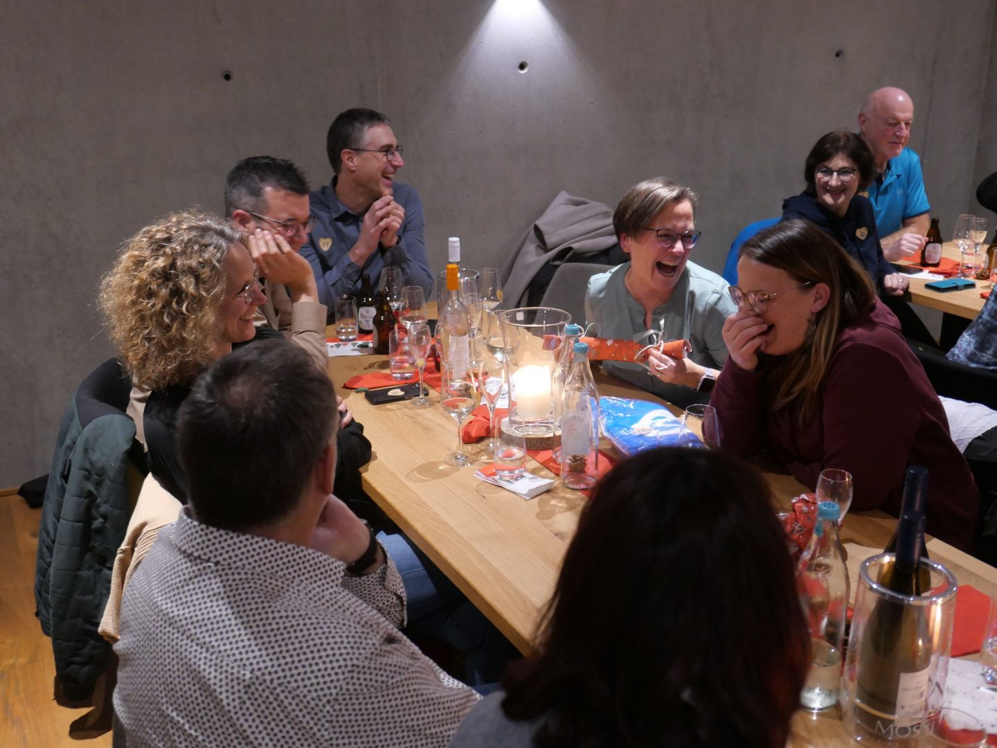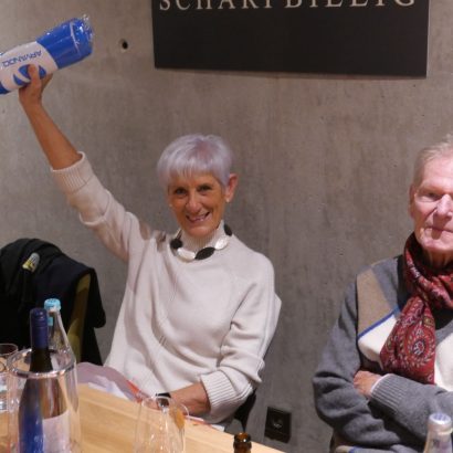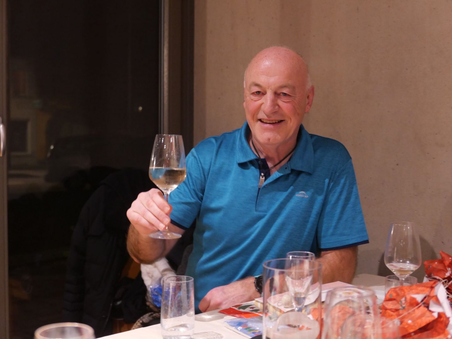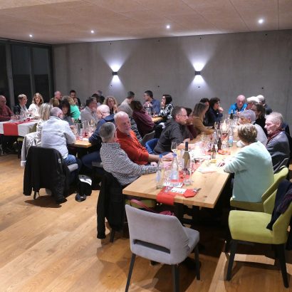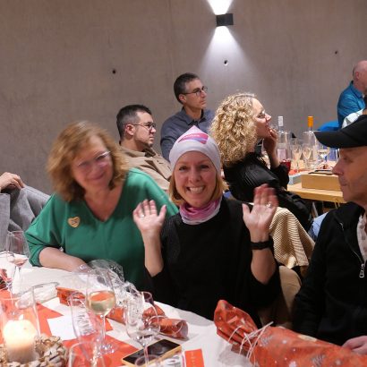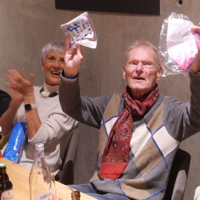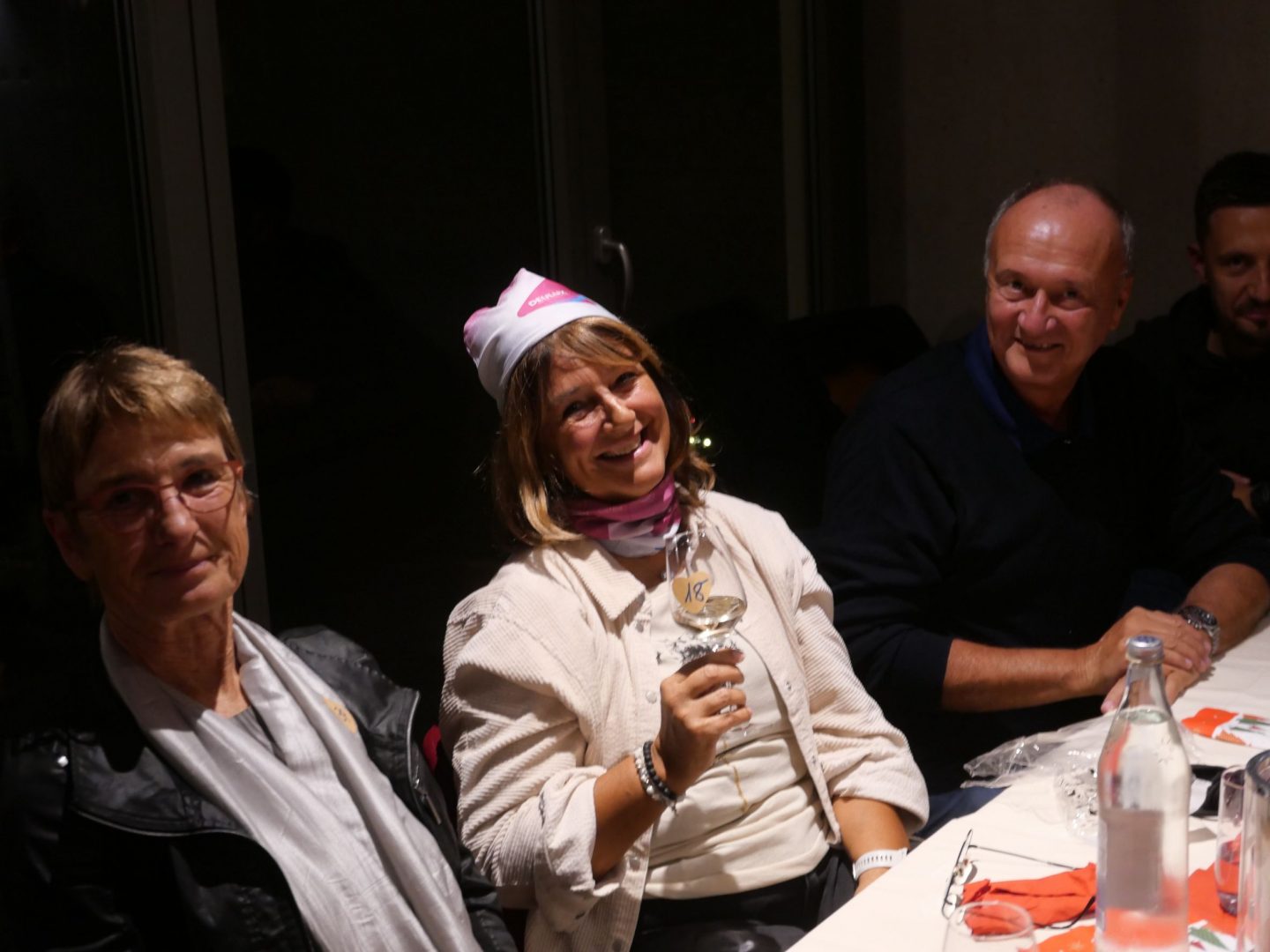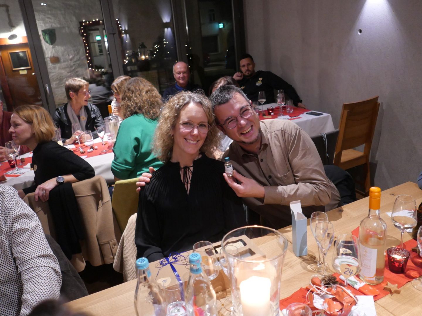 In der Weinstube ging es mit leckerem Essen vom lokalen Caterer und einer ausgesprochen überzeugenden Weinauswahl weiter. Höhepunkt des Abends war wie immer die Bescherung aus dem prall gefüllten Merchandising-Fundus – von Badetüchern über Badeöle bis hin zu Laufmützen und Buffs war alles dabei.